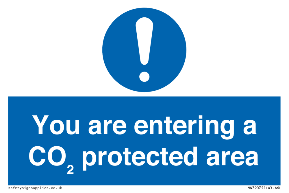 This sign contains a general Mandatory Exclamation Symbol - exclamation mark in white on blue circle background.