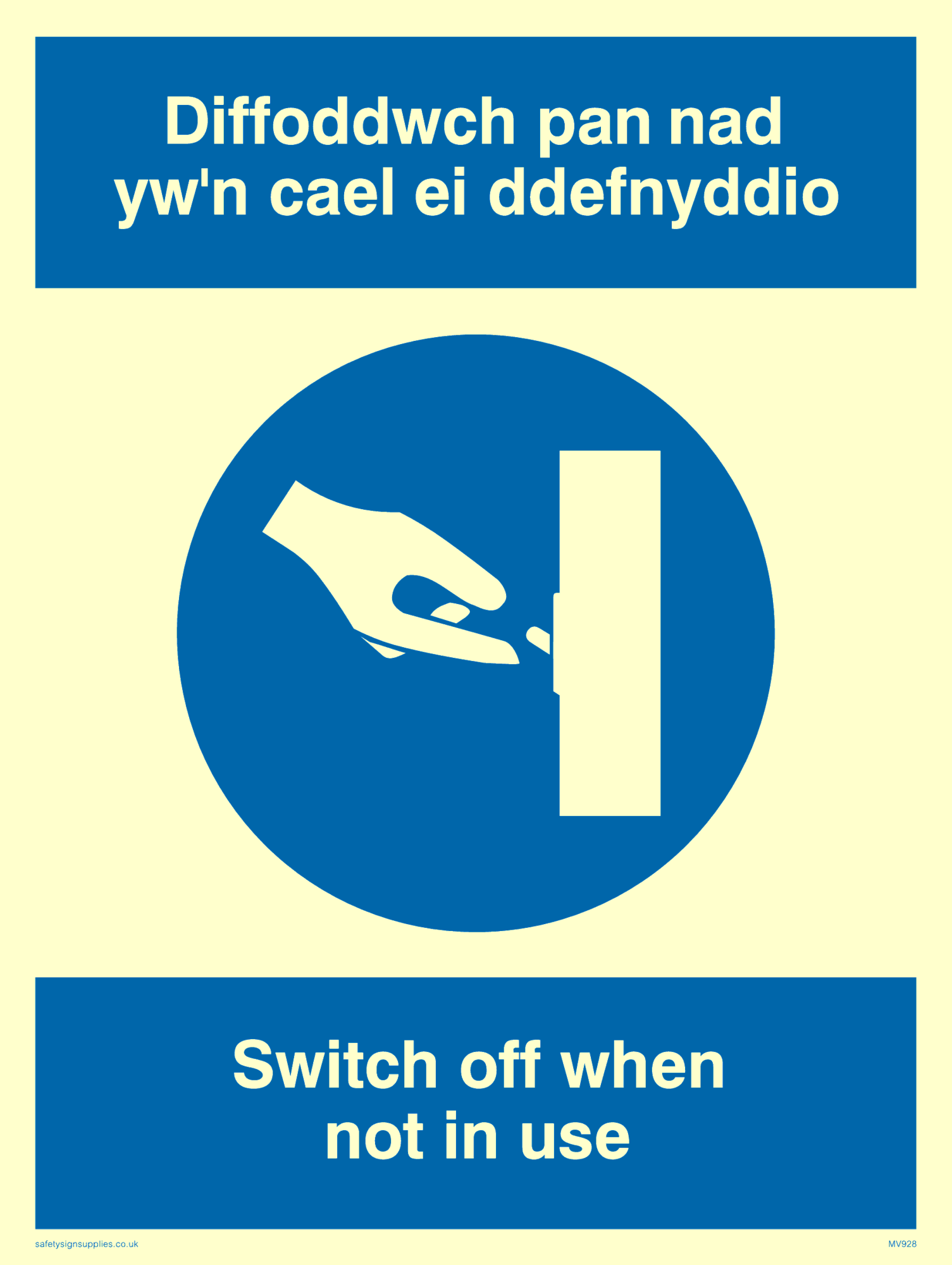 This sign contains a must switch symbol. Finger flicking switch in white on a blue circle.