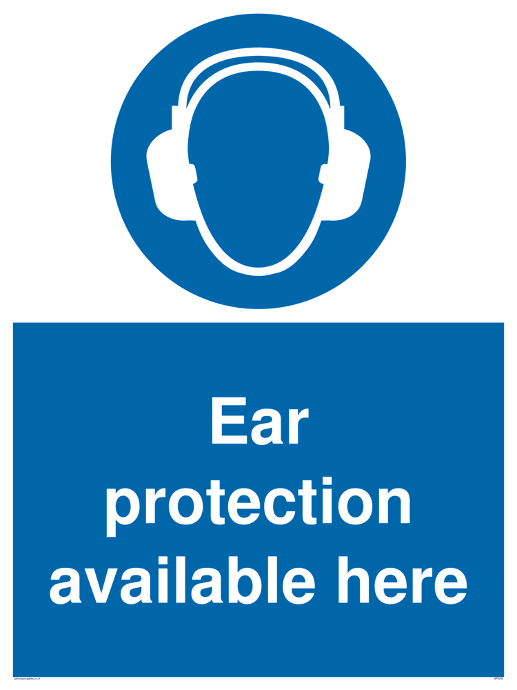 This sign contains an ear protection required symbol - person wearing ear defenders in white within blue circle.
