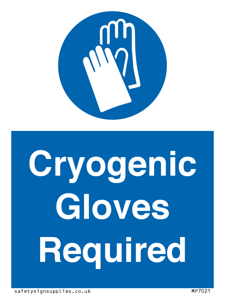 This sign contains a protective gloves required symbol - gloves in white within blue circle. Comes with a self adhesive backing. 100mm or approximately 4" high.