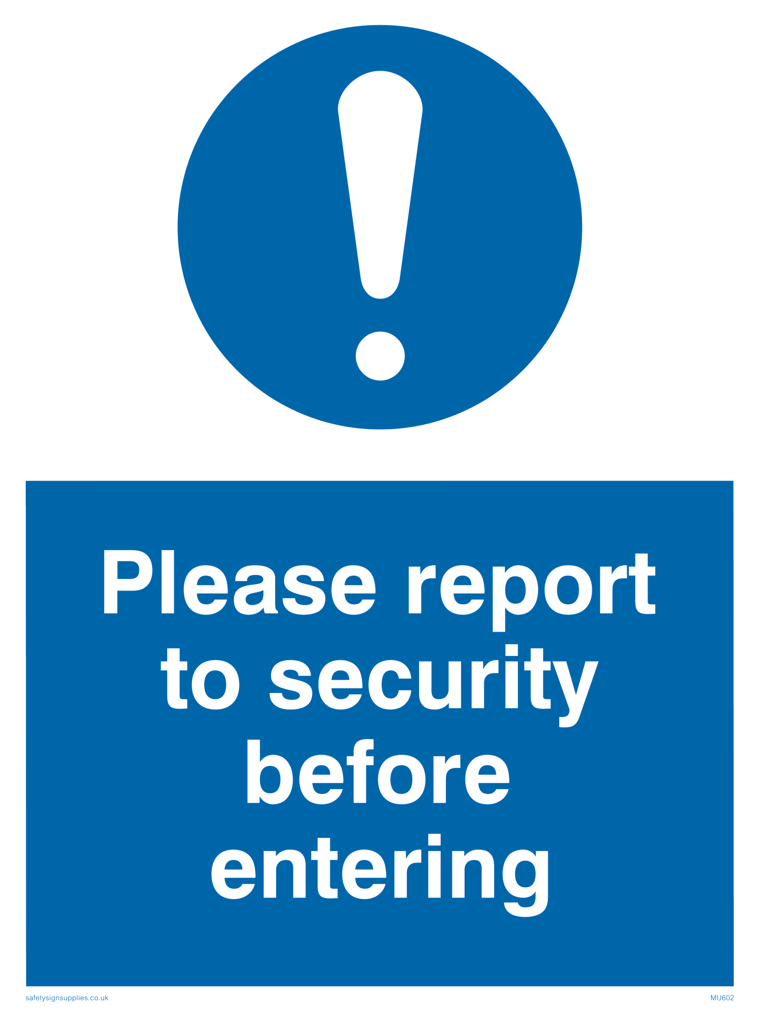 This sign contains a general Mandatory Exclamation Symbol - exclamation mark in white on blue circle background.
