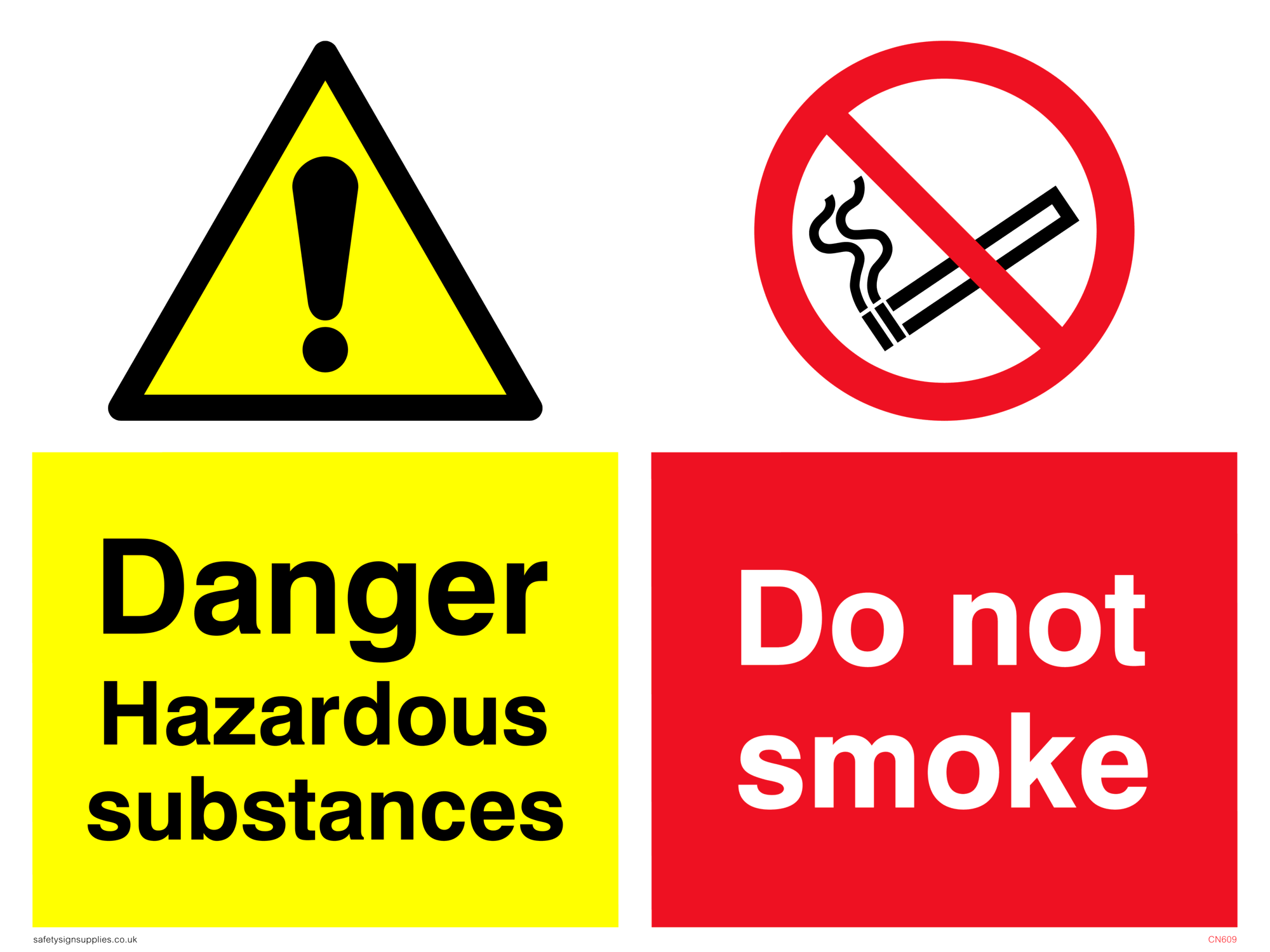 Smoking signs indicate when and where you can or cannot smoke. Health risk signs indicate and describe environmental risks to health. A combination sign combines several safety sign types on one sign. This sign is extra large.