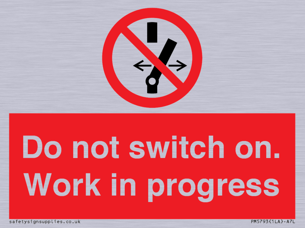 Sign Text: Do not switch on. Work in progress Product Type: Prohibition Safety Signs Dimensions: 100x75mm Material: Grained Silver Aluminium Orientation: Landscape Text Colour: White More...