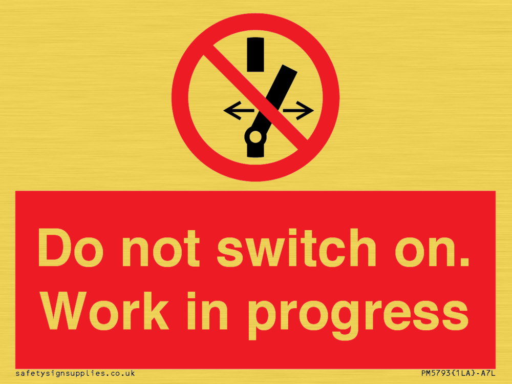 Sign Text: Do not switch on. Work in progress Product Type: Prohibition Safety Signs Dimensions: 100x75mm Material: Plastic Semi-rigid Gold Orientation: Landscape Text Colour: White More...