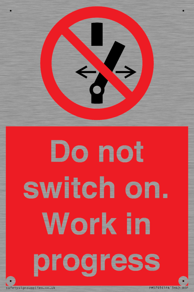 Sign Text: Do not switch on. Work in progress Product Type: Prohibition Safety Signs Dimensions: 100x150mm Material: Stainless Steel Orientation: Portrait Text Colour: White More...