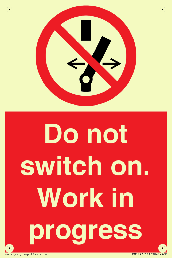 Sign Text: Do not switch on. Work in progress Product Type: Prohibition Safety Signs Dimensions: 100x150mm Material: Plastic Semi-rigid Photoluminescent Orientation: Portrait Text Colour: White More...