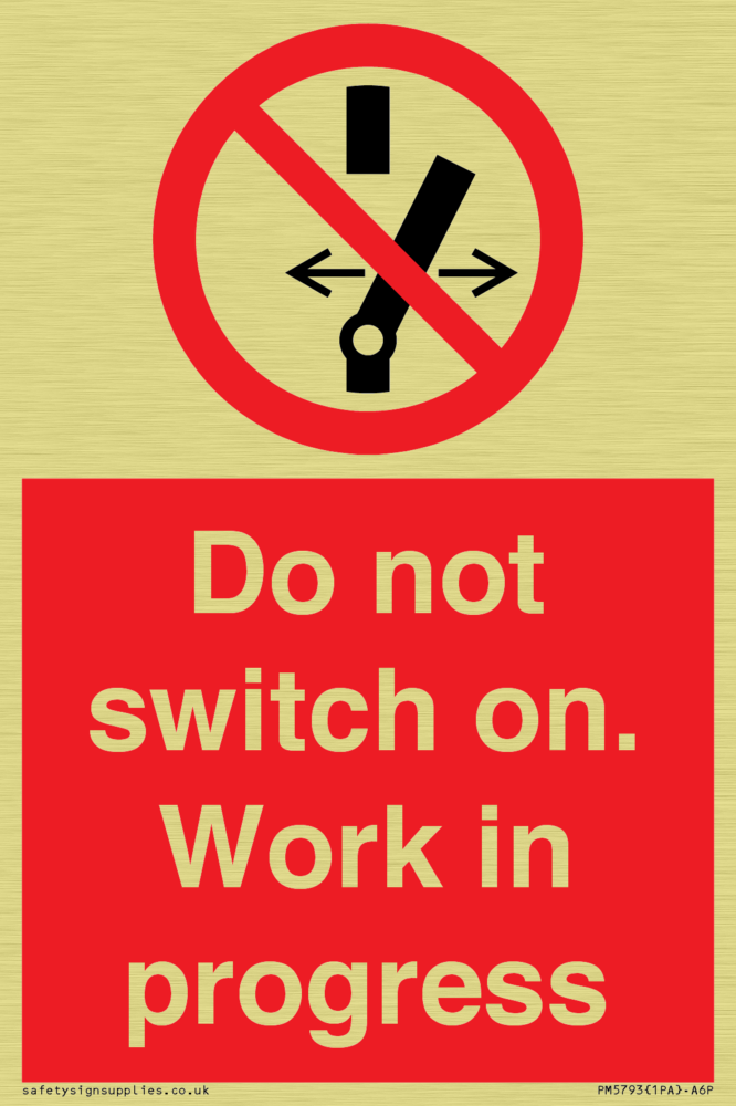 Sign Text: Do not switch on. Work in progress Product Type: Prohibition Safety Signs Dimensions: 100x150mm Material: Champagne Aluminium Orientation: Portrait Text Colour: White More...