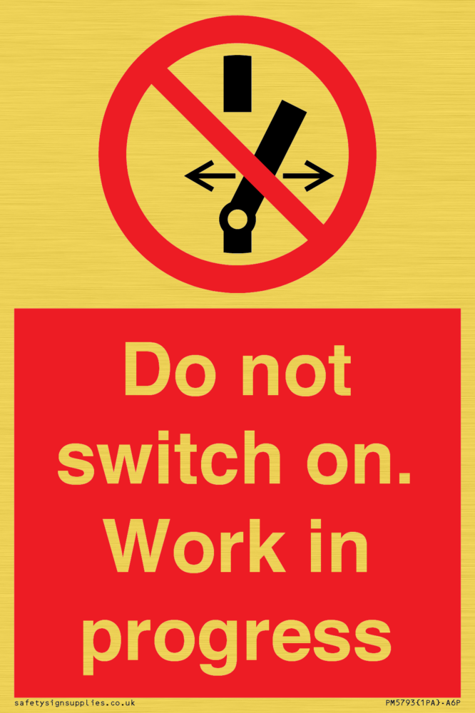 Sign Text: Do not switch on. Work in progress Product Type: Prohibition Safety Signs Dimensions: 100x150mm Material: Plastic Semi-rigid Gold Orientation: Portrait Text Colour: White More...