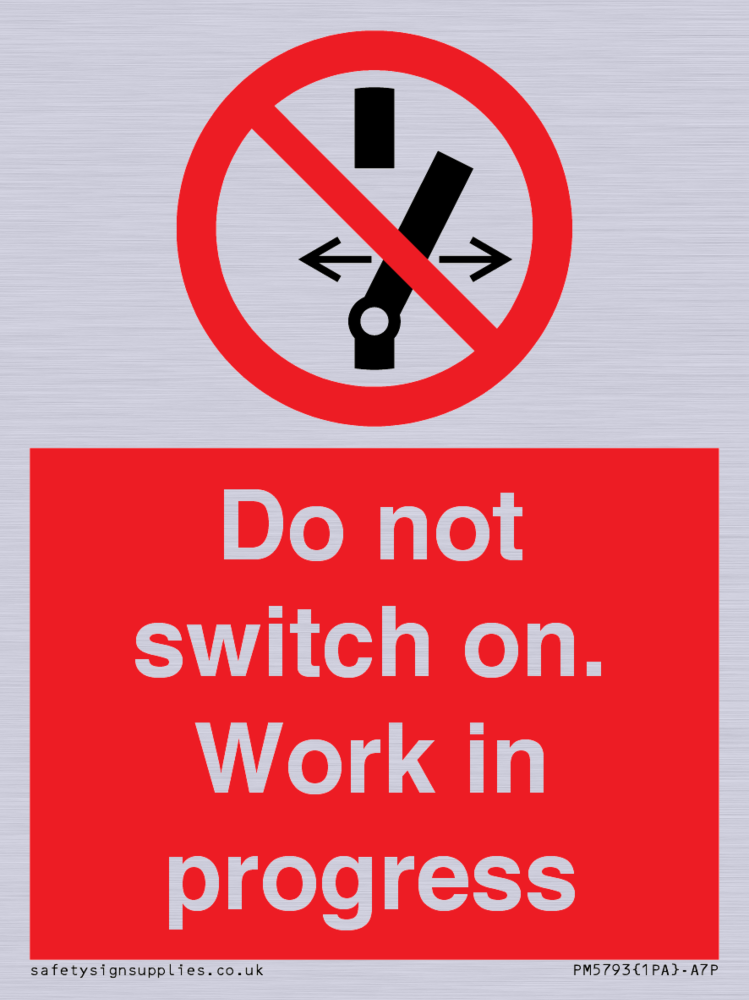 Sign Text: Do not switch on. Work in progress Product Type: Prohibition Safety Signs Dimensions: 75x100mm Material: Plastic Semi-rigid Silver Orientation: Portrait Text Colour: White More...