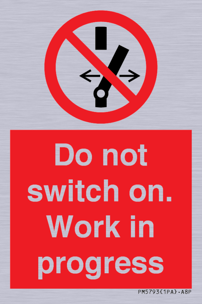 Sign Text: Do not switch on. Work in progress Product Type: Prohibition Safety Signs Dimensions: 50x75mm Material: Grained Silver Aluminium Orientation: Portrait Text Colour: White More...