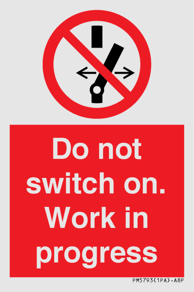 Sign Text: Do not switch on. Work in progress Product Type: Prohibition Safety Signs Dimensions: 50x75mm Material: White Reflective Aluminium Composite 3mm Orientation: Portrait Text Colour: White More...