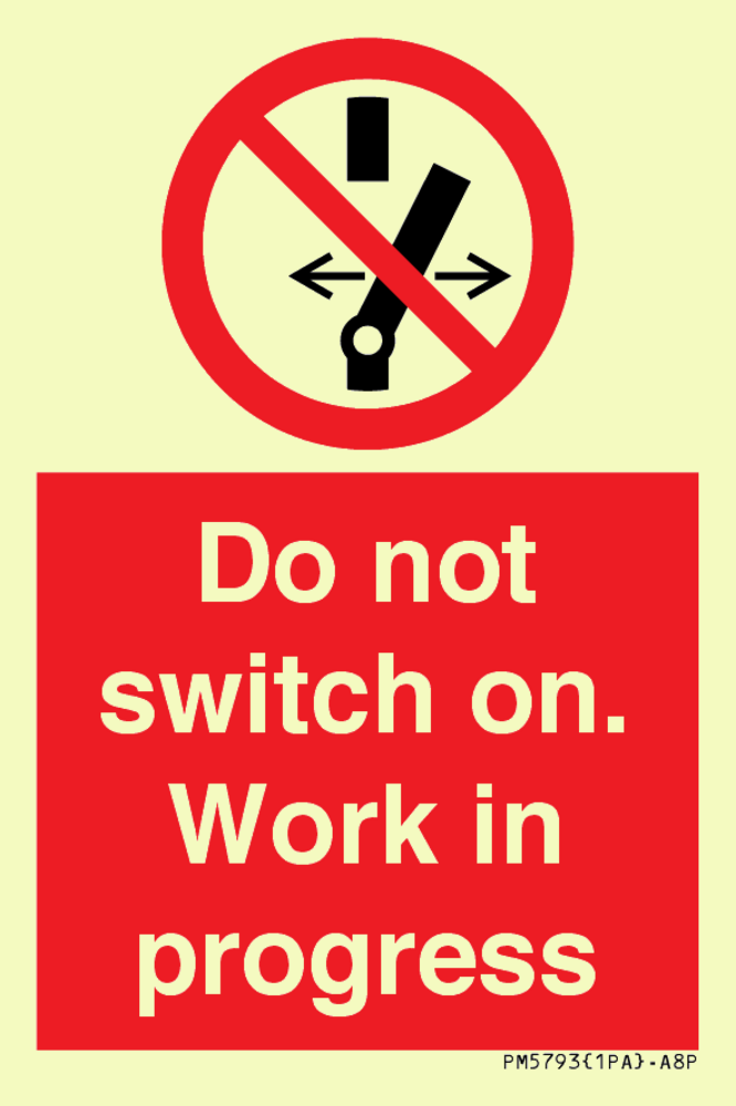 Sign Text: Do not switch on. Work in progress Product Type: Prohibition Safety Signs Dimensions: 50x75mm Material: Plastic Semi-rigid Photoluminescent Orientation: Portrait Text Colour: White More...