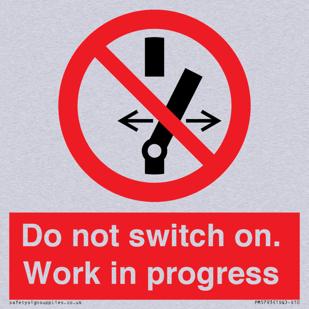 Sign Text: Do not switch on. Work in progress Product Type: Prohibition Safety Signs Dimensions: 100x100mm Material: Satin Silver Aluminium Orientation: Square Text Colour: White More...
