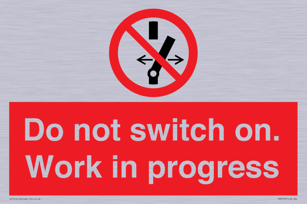 Sign Text: Do not switch on. Work in progress Product Type: Prohibition Safety Signs Dimensions: 300x200mm Material: Grained Silver Aluminium Orientation: Landscape Text Colour: White More...