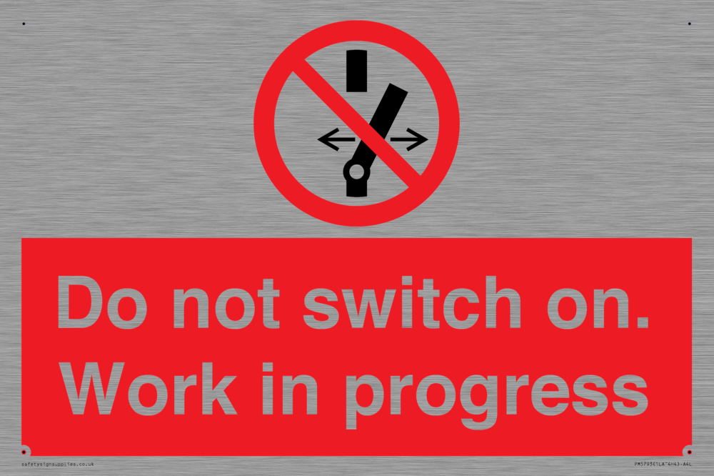 Sign Text: Do not switch on. Work in progress Product Type: Prohibition Safety Signs Dimensions: 300x200mm Material: Stainless Steel Orientation: Landscape Text Colour: White More...