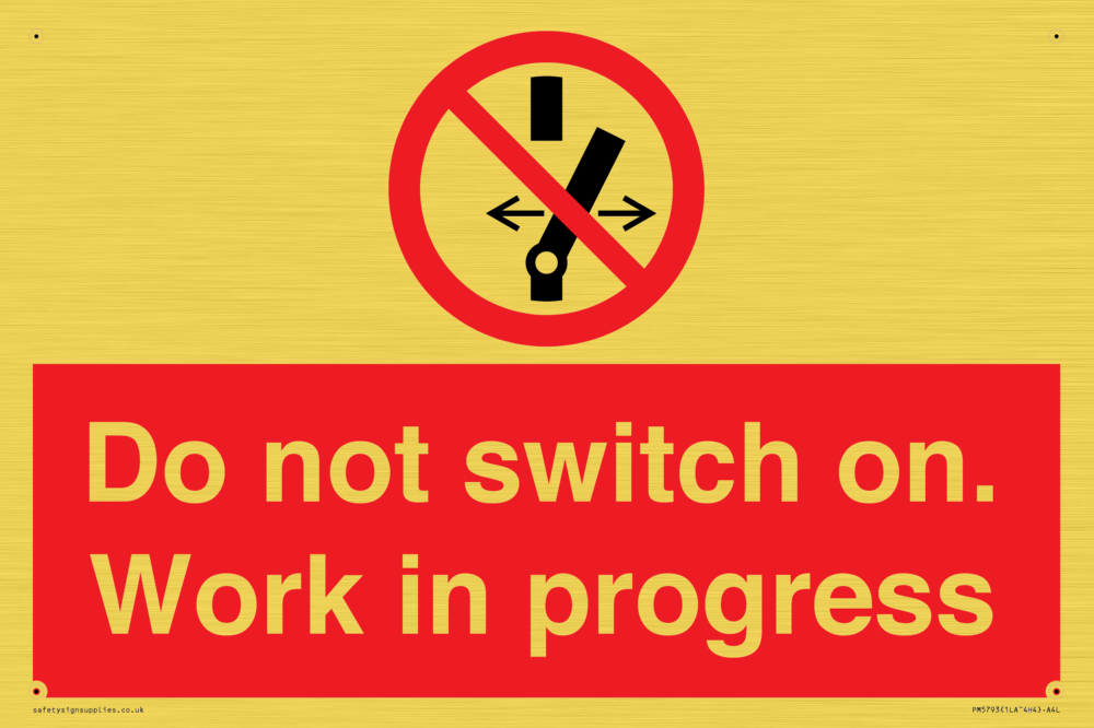 Sign Text: Do not switch on. Work in progress Product Type: Prohibition Safety Signs Dimensions: 300x200mm Material: Plastic Semi-rigid Gold Orientation: Landscape Text Colour: White More...