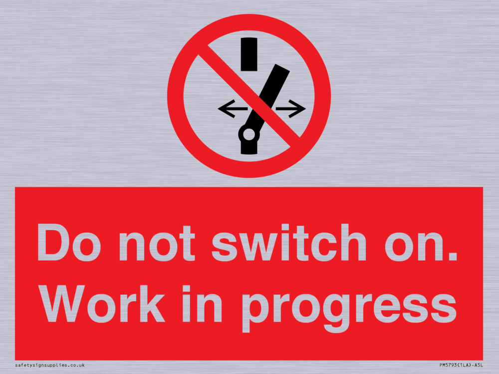 Sign Text: Do not switch on. Work in progress Product Type: Prohibition Safety Signs Dimensions: 200x150mm Material: Grained Silver Aluminium Orientation: Landscape Text Colour: White More...