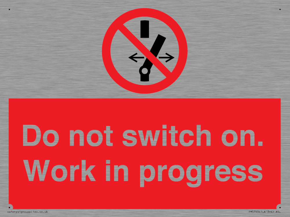 Sign Text: Do not switch on. Work in progress Product Type: Prohibition Safety Signs Dimensions: 200x150mm Material: Stainless Steel Orientation: Landscape Text Colour: White More...
