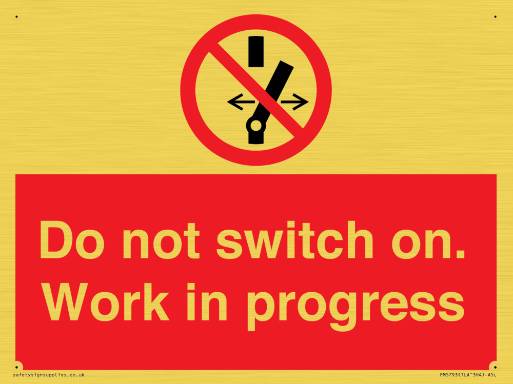 Sign Text: Do not switch on. Work in progress Product Type: Prohibition Safety Signs Dimensions: 200x150mm Material: Plastic Semi-rigid Gold Orientation: Landscape Text Colour: White More...