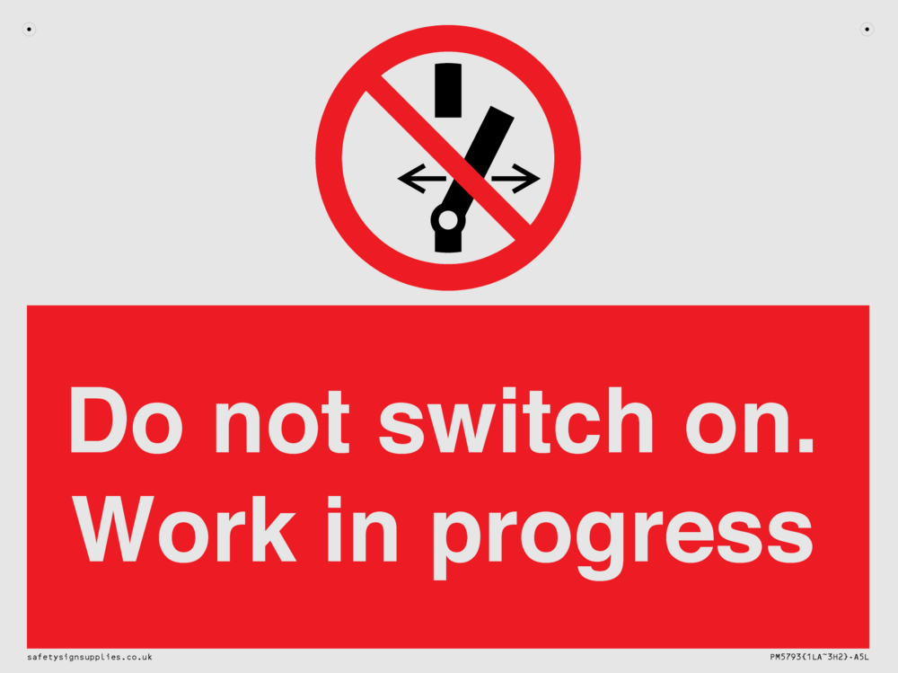 Sign Text: Do not switch on. Work in progress Product Type: Prohibition Safety Signs Dimensions: 200x150mm Material: White Reflective Aluminium Composite 3mm Orientation: Landscape Text Colour: White More...