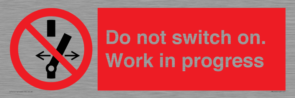 Sign Text: Do not switch on. Work in progress Product Type: Prohibition Safety Signs Dimensions: 450x150mm Material: Stainless Steel Text Colour: White Background Colour: Red More...