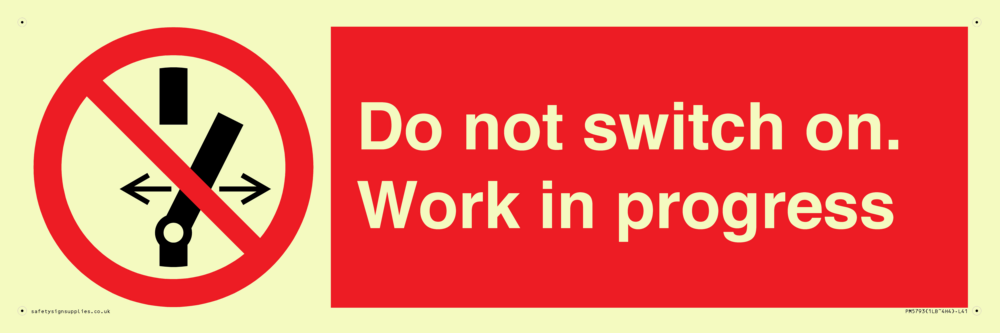Sign Text: Do not switch on. Work in progress Product Type: Prohibition Safety Signs Dimensions: 450x150mm Material: Plastic Semi-rigid Photoluminescent Text Colour: White Background Colour: Red More...