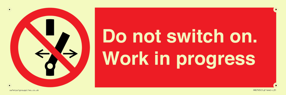 Sign Text: Do not switch on. Work in progress Product Type: Prohibition Safety Signs Dimensions: 300x100mm Material: Plastic Semi-rigid Photoluminescent Text Colour: White Background Colour: Red More...