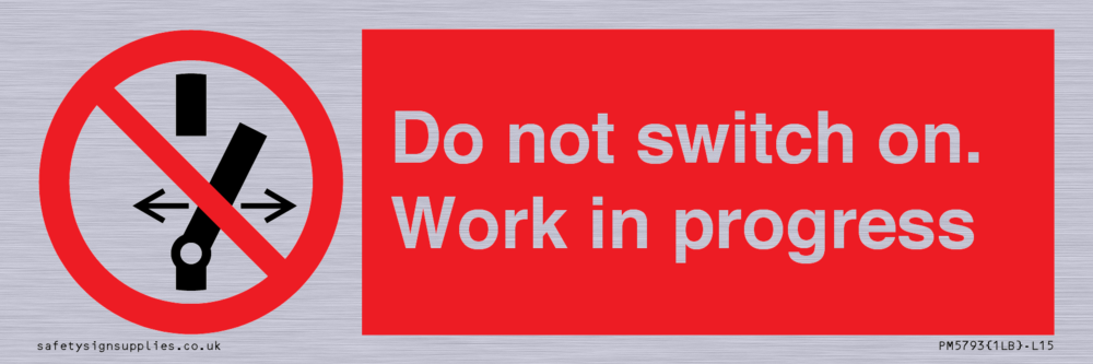 Sign Text: Do not switch on. Work in progress Product Type: Prohibition Safety Signs Dimensions: 150x50mm Material: Grained Silver Aluminium Text Colour: White Background Colour: Red More...