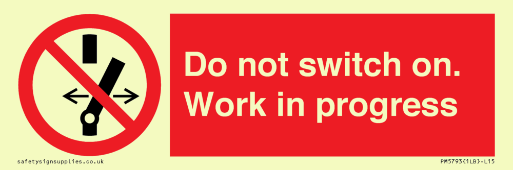 Sign Text: Do not switch on. Work in progress Product Type: Prohibition Safety Signs Dimensions: 150x50mm Material: Plastic Semi-rigid Photoluminescent Text Colour: White Background Colour: Red More...