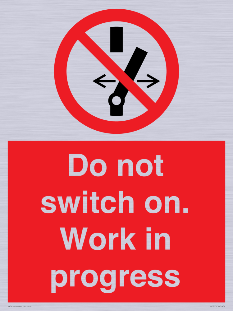 Sign Text: Do not switch on. Work in progress Product Type: Prohibition Safety Signs Dimensions: 300x400mm Material: Plastic Semi-rigid Silver Orientation: Portrait Text Colour: White More...