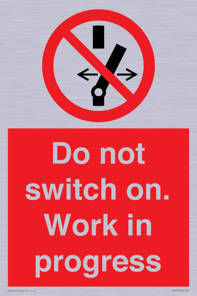 Sign Text: Do not switch on. Work in progress Product Type: Prohibition Safety Signs Dimensions: 200x300mm Material: Grained Silver Aluminium Orientation: Portrait Text Colour: White More...