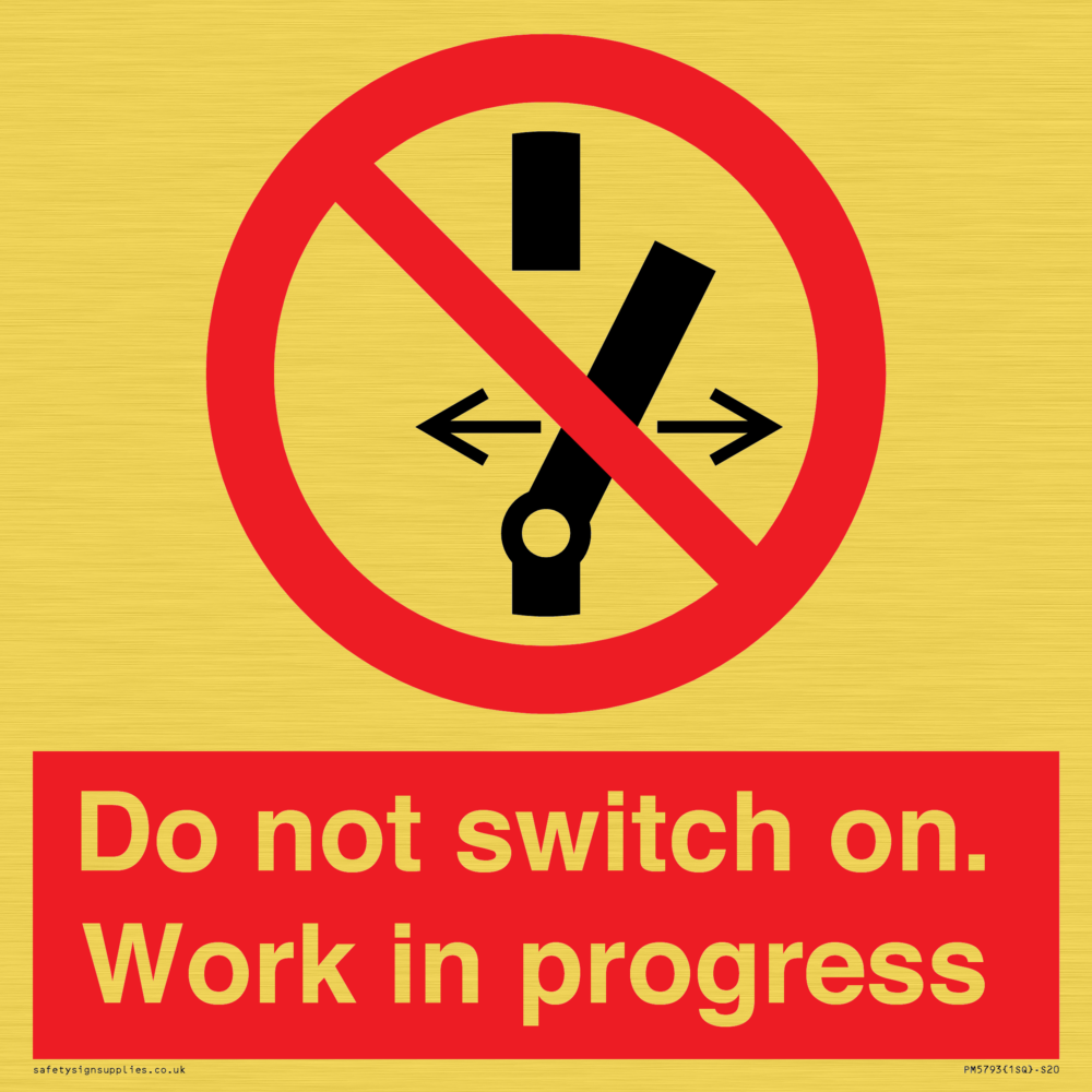 Sign Text: Do not switch on. Work in progress Product Type: Prohibition Safety Signs Dimensions: 200x200mm Material: Plastic Semi-rigid Gold Orientation: Square Text Colour: White More...
