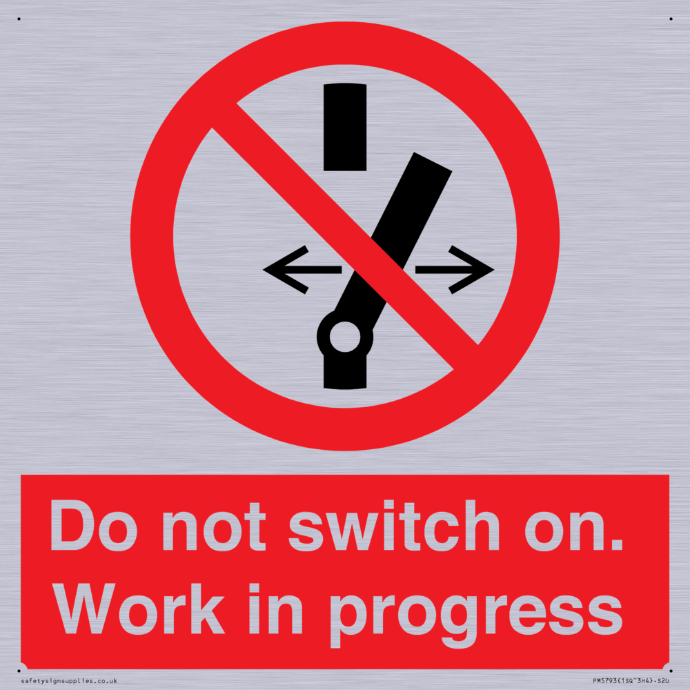 Sign Text: Do not switch on. Work in progress Product Type: Prohibition Safety Signs Dimensions: 200x200mm Material: Grained Silver Aluminium Orientation: Square Text Colour: White More...