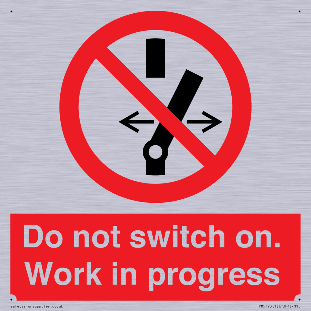 Sign Text: Do not switch on. Work in progress Product Type: Prohibition Safety Signs Dimensions: 150x150mm Material: Grained Silver Aluminium Orientation: Square Text Colour: White More...