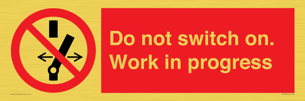 Sign Text: Do not switch on. Work in progress Product Type: Prohibition Safety Signs Dimensions: 600x200mm Material: Plastic Semi-rigid Gold Text Colour: White Background Colour: Red More...
