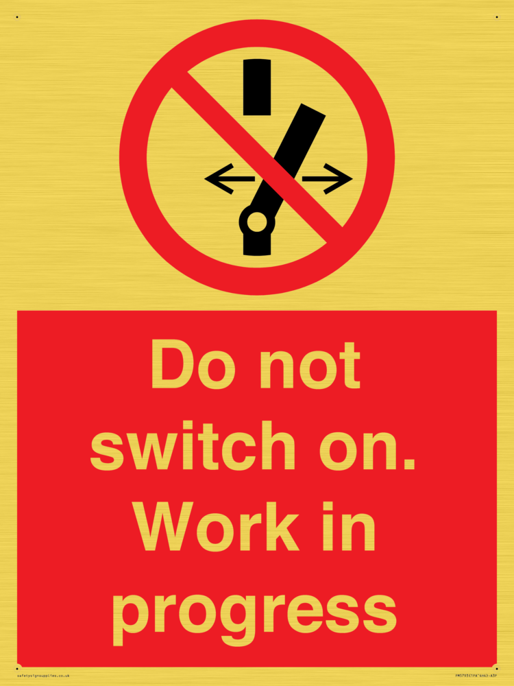 Sign Text: Do not switch on. Work in progress Product Type: Prohibition Safety Signs Dimensions: 300x400mm Material: Plastic Semi-rigid Gold Orientation: Portrait Text Colour: White More...