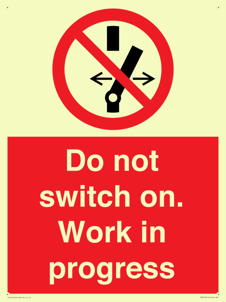 Sign Text: Do not switch on. Work in progress Product Type: Prohibition Safety Signs Dimensions: 300x400mm Material: Plastic Semi-rigid Photoluminescent Orientation: Portrait Text Colour: White More...