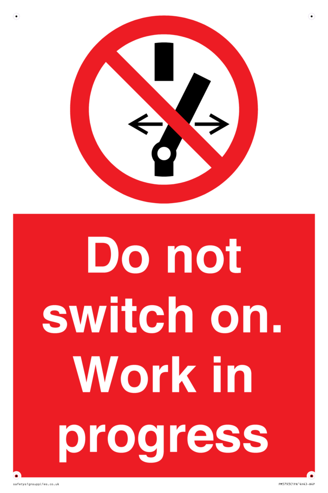 Sign Text: Do not switch on. Work in progress Product Type: Prohibition Safety Signs Dimensions: 200x300mm Material: Plastic Semi-rigid 1mm Orientation: Portrait Text Colour: White More...