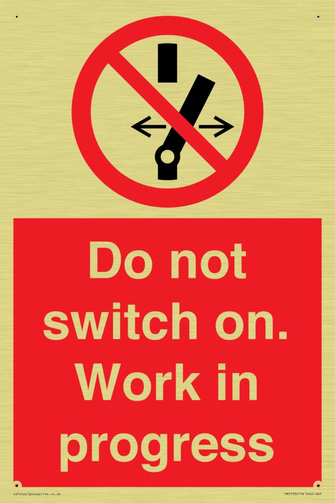 Sign Text: Do not switch on. Work in progress Product Type: Prohibition Safety Signs Dimensions: 200x300mm Material: Champagne Aluminium Orientation: Portrait Text Colour: White More...
