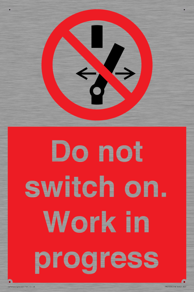 Sign Text: Do not switch on. Work in progress Product Type: Prohibition Safety Signs Dimensions: 200x300mm Material: Stainless Steel Orientation: Portrait Text Colour: White More...