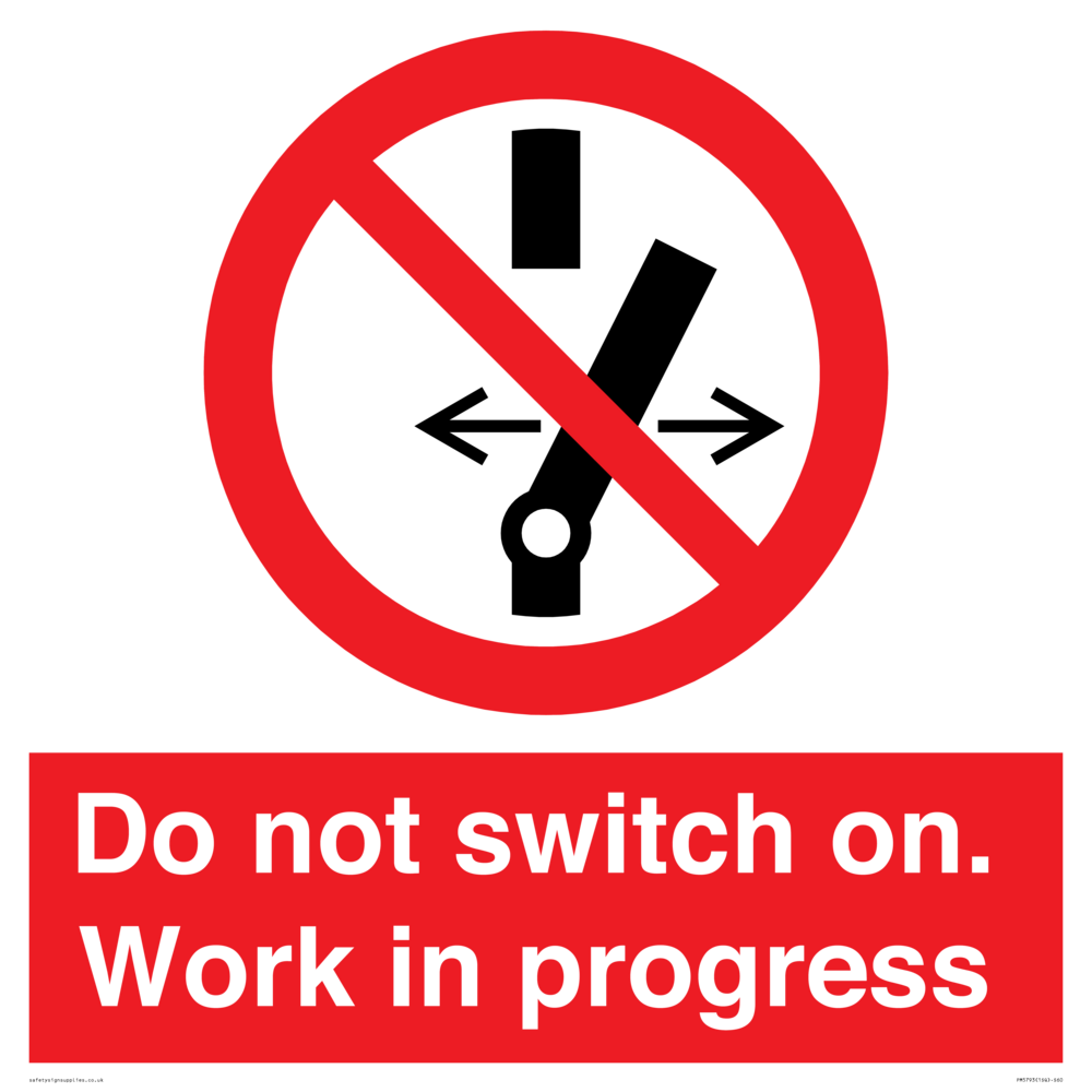 Sign Text: Do not switch on. Work in progress Product Type: Prohibition Safety Signs Dimensions: 600x600mm Material: Vinyl High Tack Orientation: Square Text Colour: White More...
