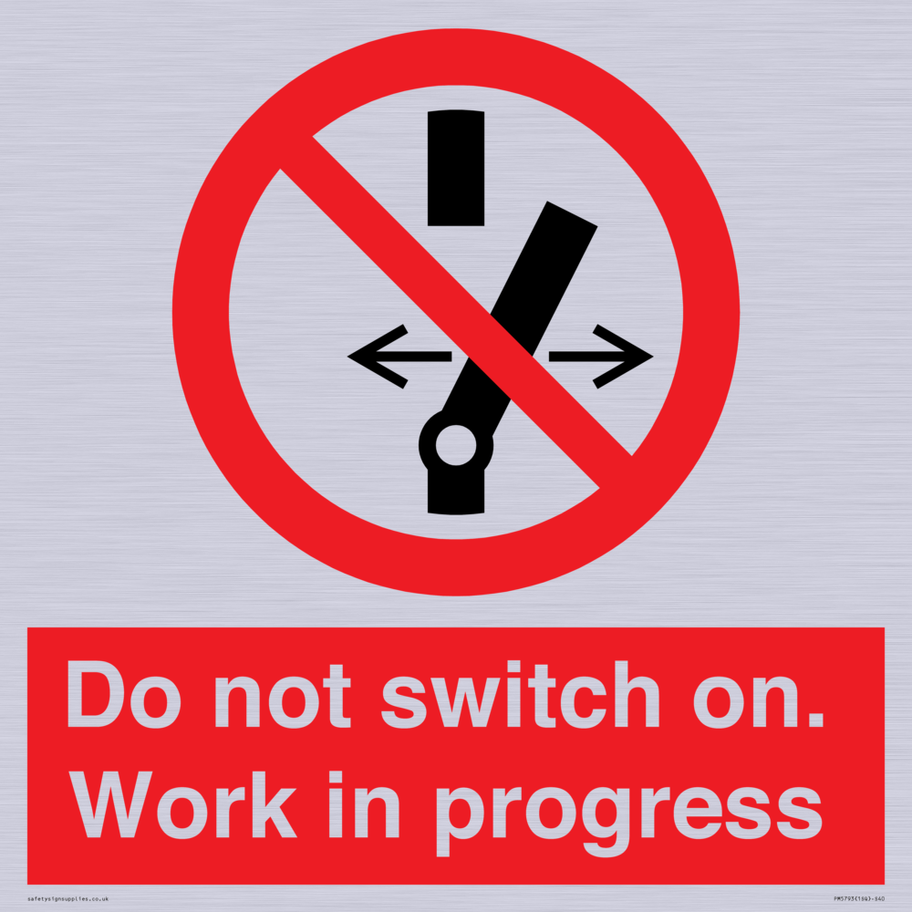 Sign Text: Do not switch on. Work in progress Product Type: Prohibition Safety Signs Dimensions: 400x400mm Material: Plastic Semi-rigid Silver Orientation: Square Text Colour: White More...