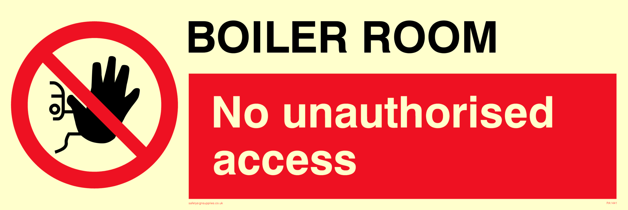 Boiler room. No unauthorised access sign, with no access symbol in black in a red prohibition circle. Black text on white, and white text on red.