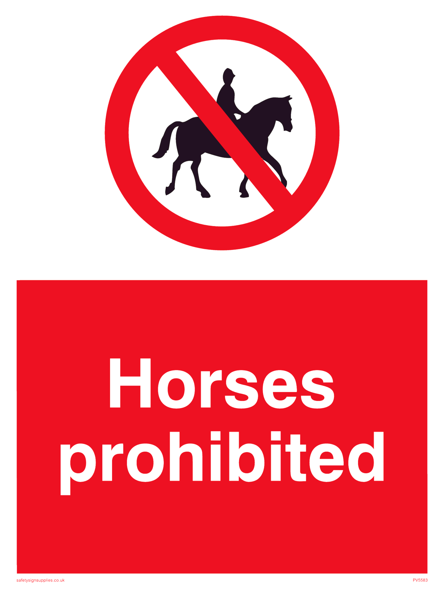 This sign contains a man on a horse symbol - black on white background within a red circle. Comes with a self adhesive backing.