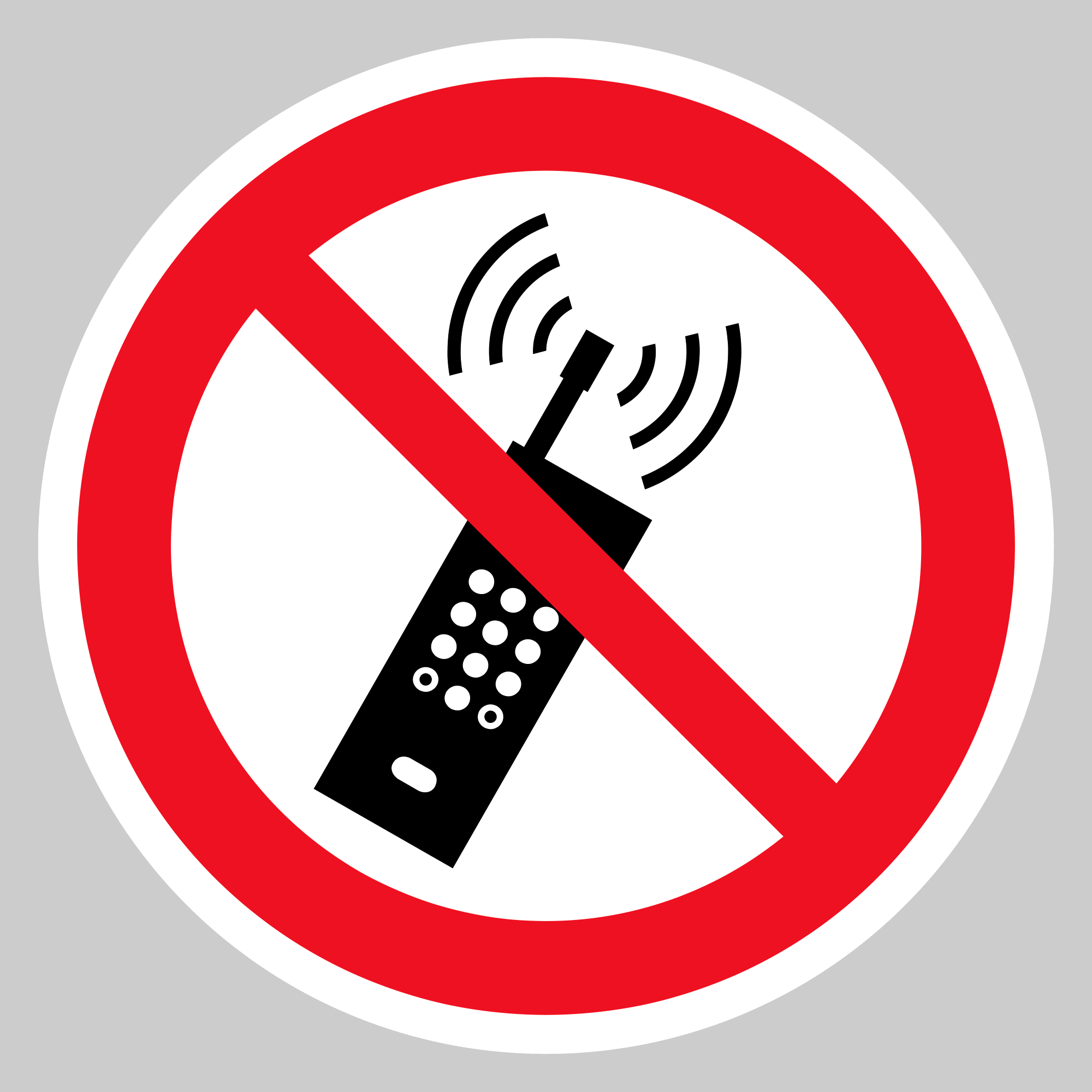 This sign contains a no mobile phones symbol, black mobile phone with red prohibition circle with diagonal line crossed through.
