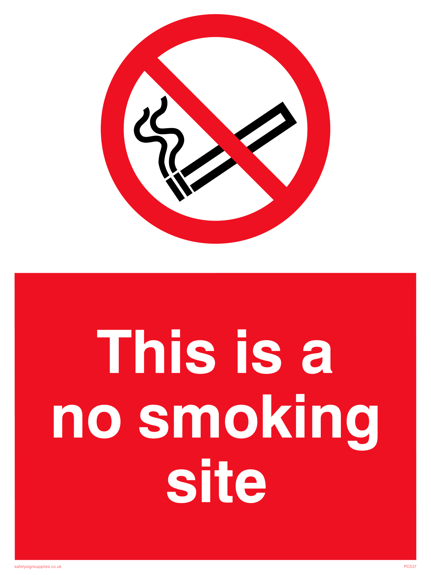 This sign contains a no smoking symbol - cigarette and smoke in black with red prohibition circle and line diagonally crossed through.