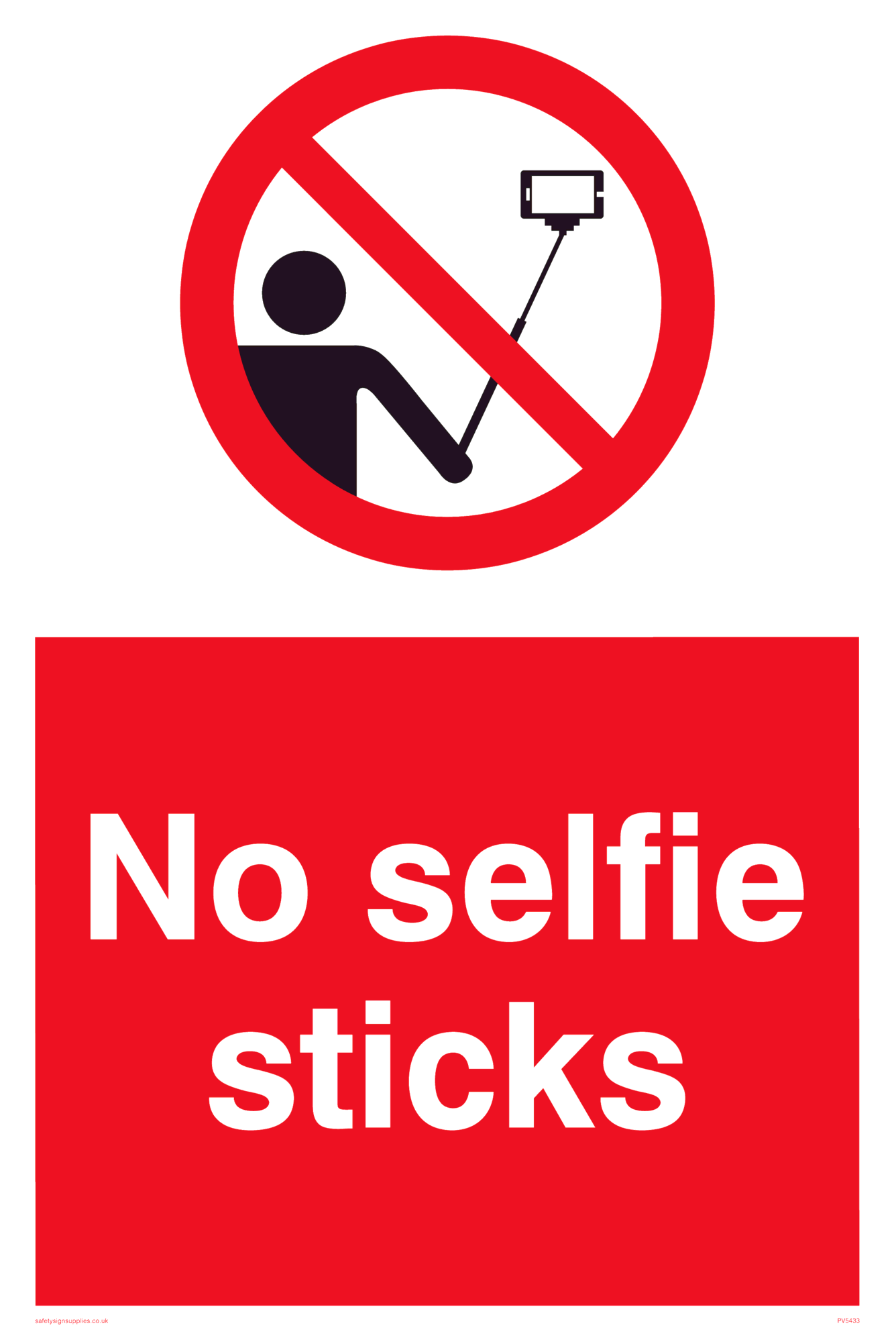This sign contains a no selfie sticks symbol - outline of a man using a selfie stick in black with red circle crossed through.