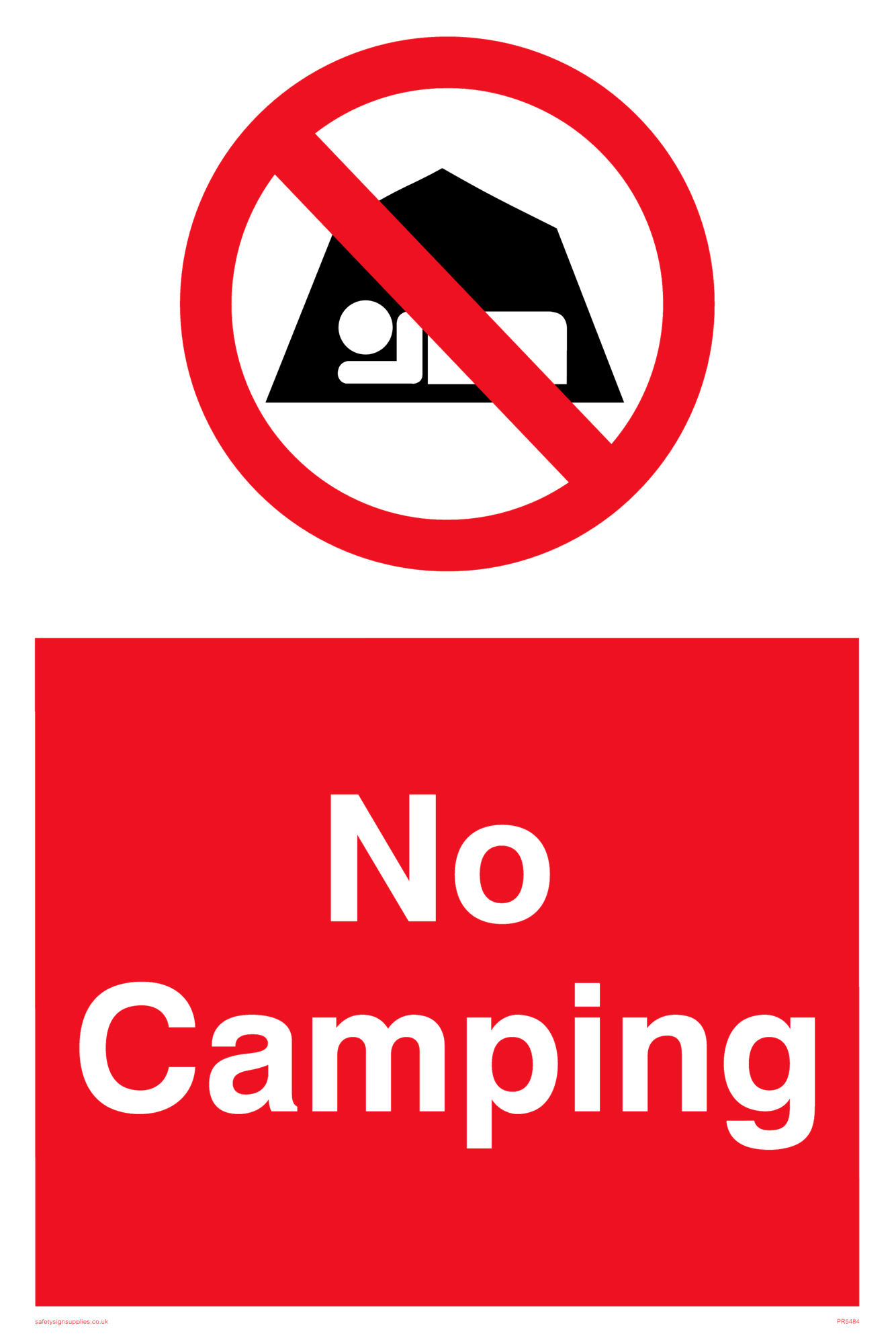 This sign contains a no camping symbol - person in tent in black with red circle crossed through.