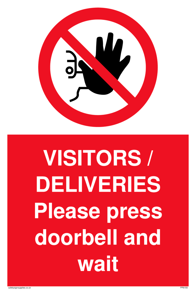 Sign Text: VISITORS / DELIVERIES Please press doorbell and wait