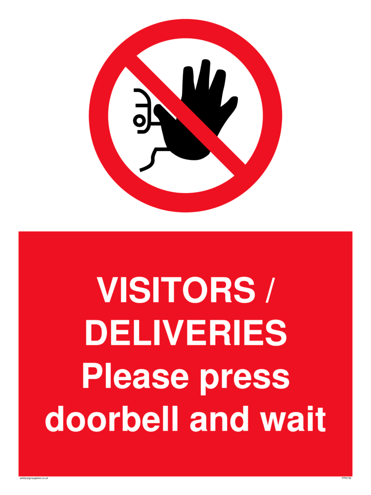 Sign Text: VISITORS / DELIVERIES Please press doorbell and wait